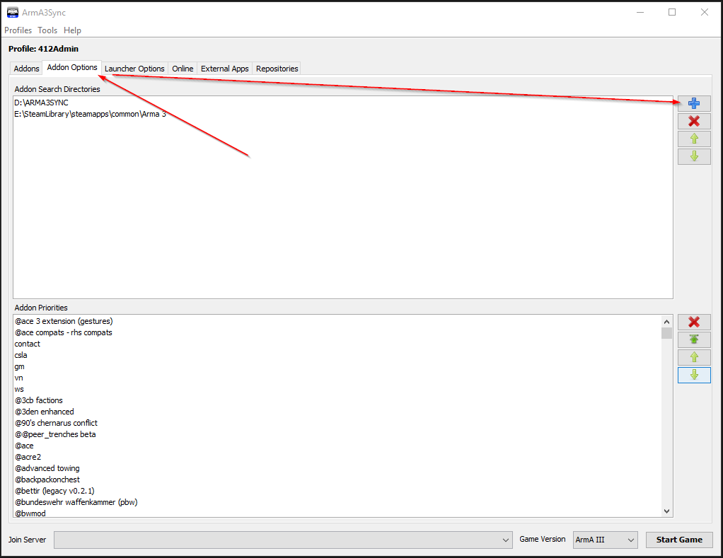 Starte ArmA3Sync und gehe auf den Reiter "Addon Options", klicke auf das blaue Plus-Symbol und wähle hier das Verzeichnis, das Du gerade erzeugt hast.