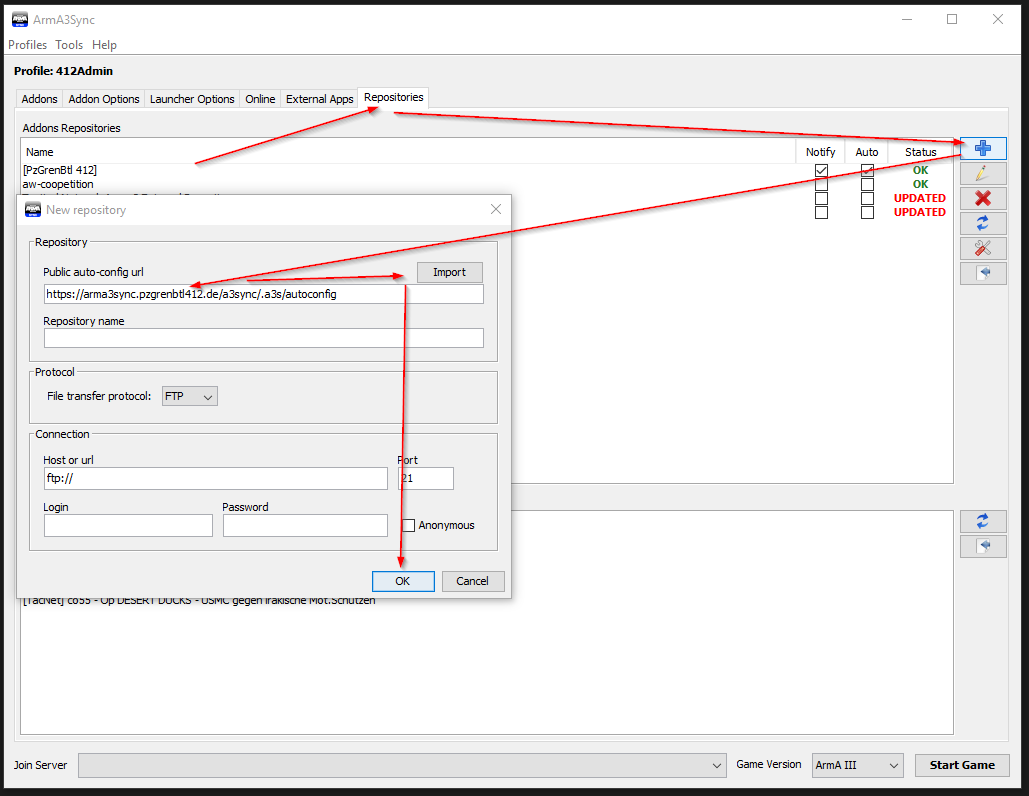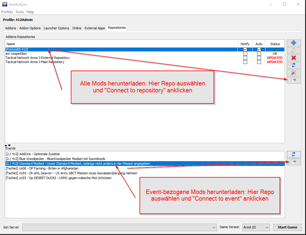 Jetzt findest Du unter "Repositories" den Eintrag "[PzGrenBtl 412]" und unter "Events" unsere verschiedenen Zusammenstellungen (Modsets).