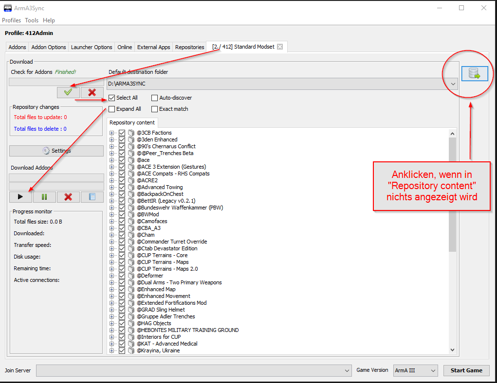 Auch bei Verwendung von ArmA3Sync werden natürlich weiterhin die Updates des Mods oder auch Aktualisierungen von Modsets benötigt.