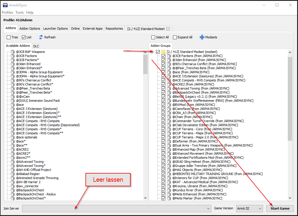 Jetzt noch die Modsets aktivieren (Haken setzen) und mit "Start Game" ArmA starten.