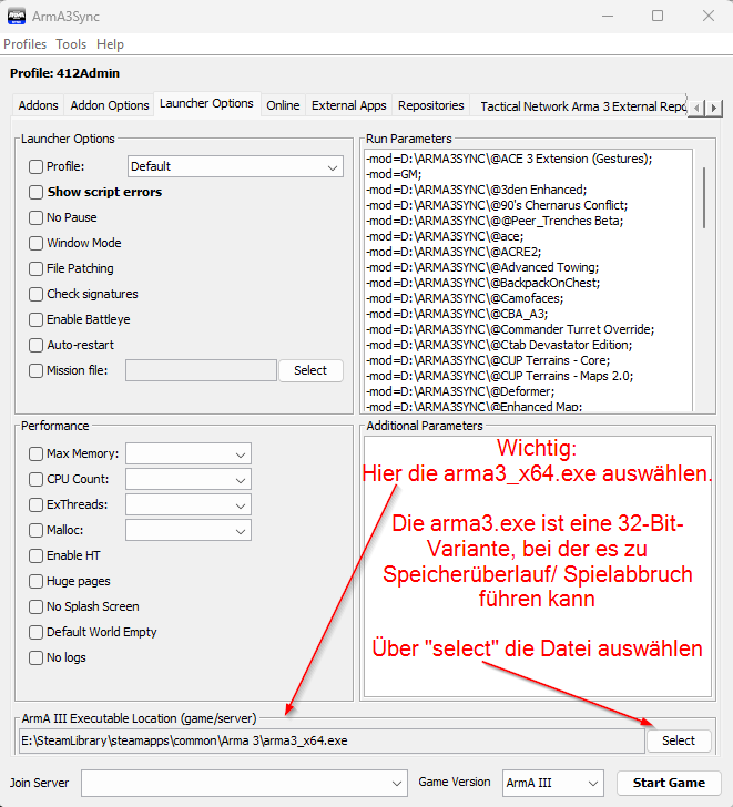 Im Tab "Launcher Options" beachten, dass Du die 64-Bit-Version ausgewählt hast, arma3_x64.exe. Nicht die arma3.exe nehmen, das ist die 32-Bit-Version; diese kann nicht genug Arbeitsspeicher verwenden.